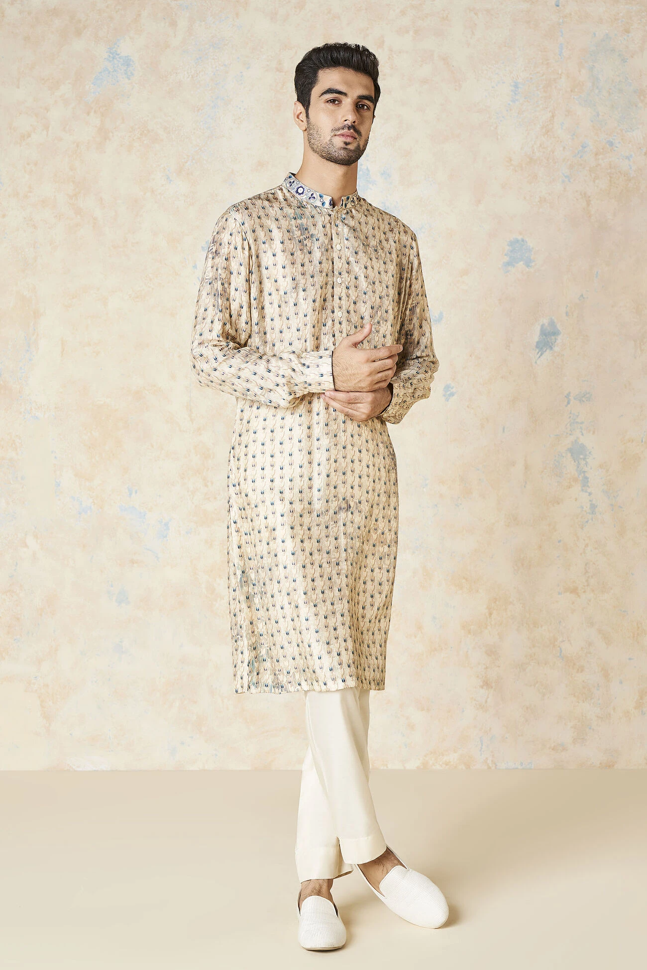 Crafted in a soothing color, Sahan is a great addition to your occasionwear wardrobe. It can be paired with our Nehru jacket, featuring the same print.Â