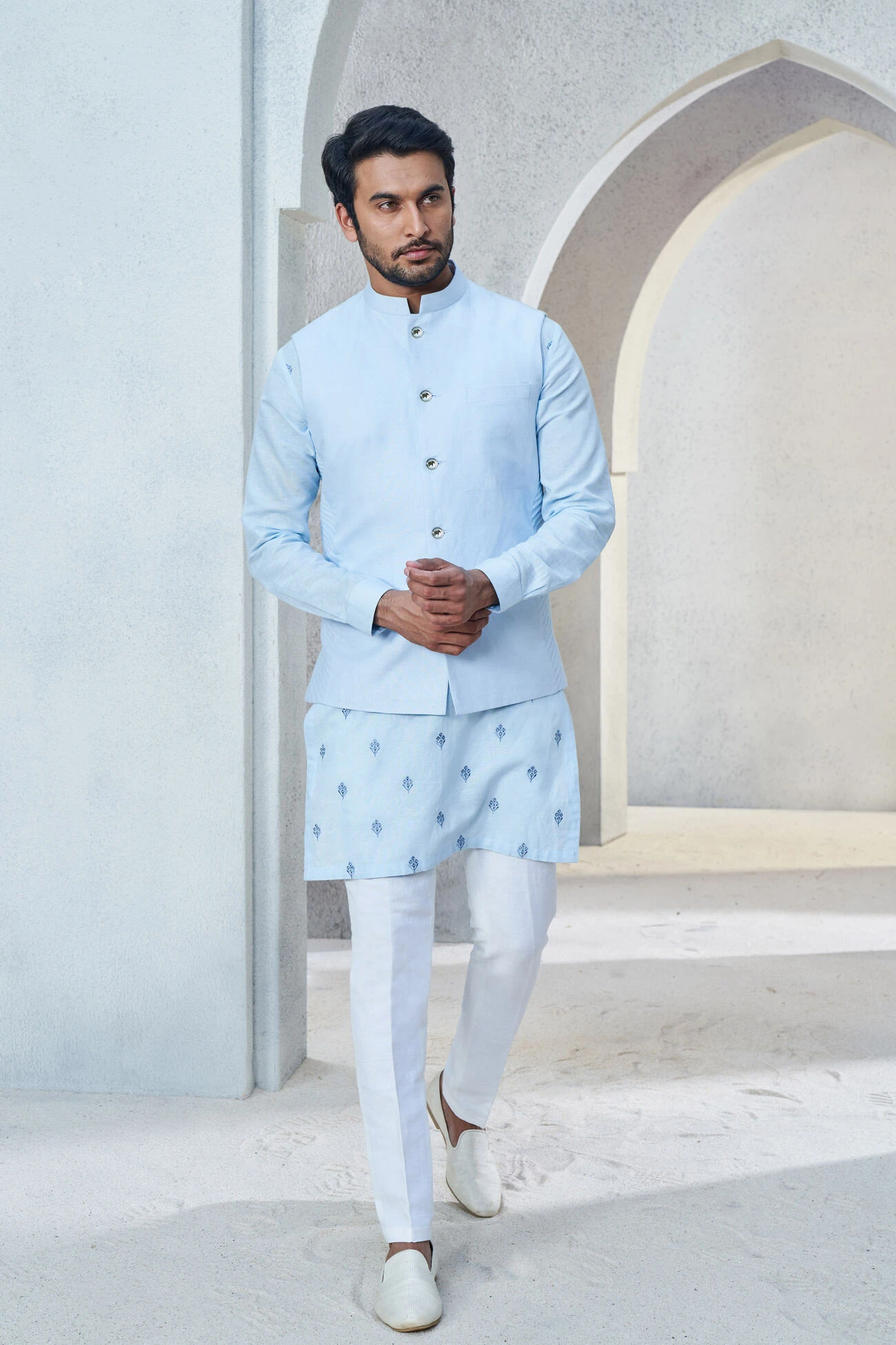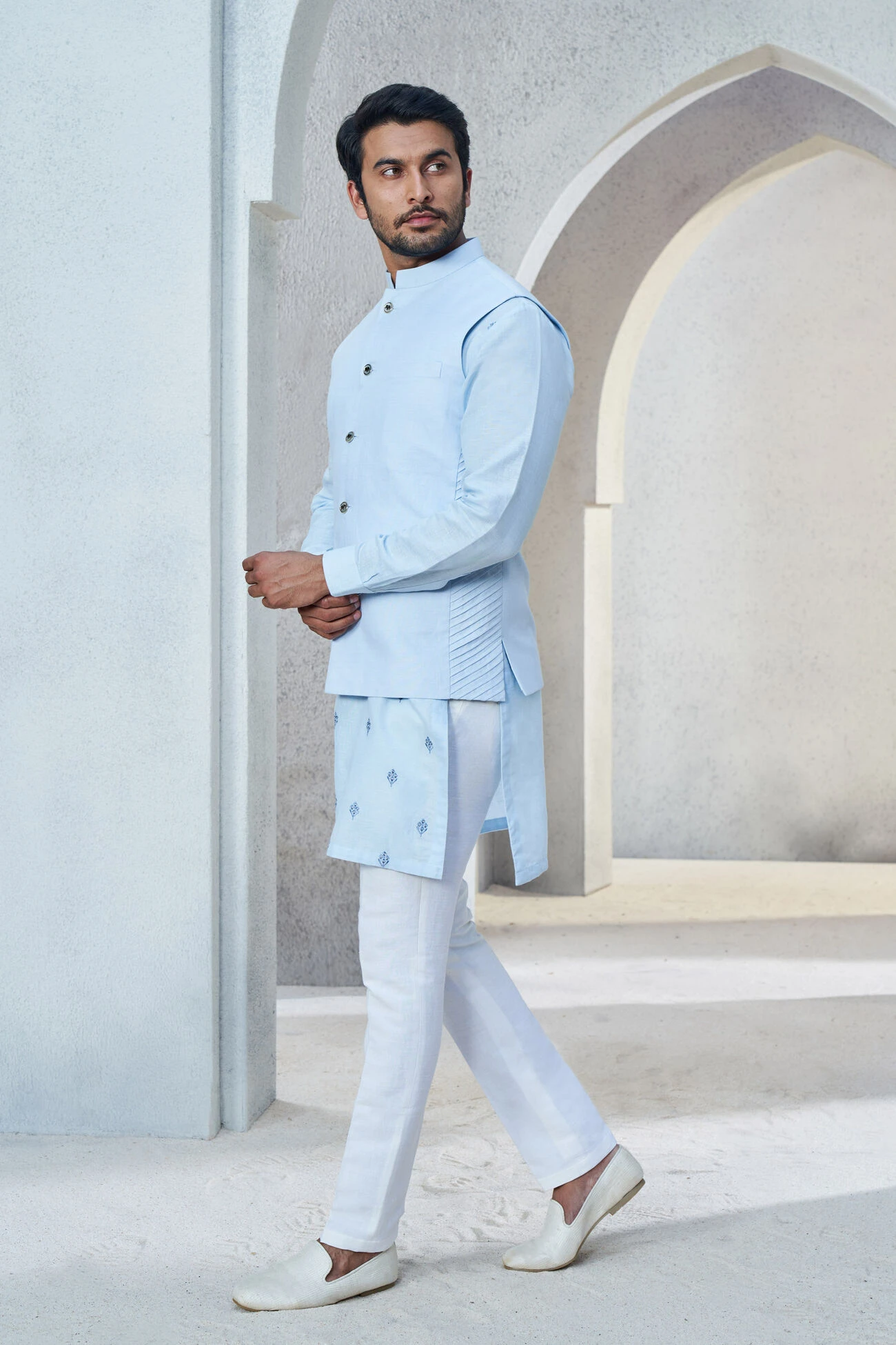 Shwar is a versatile Nehru jacket that can be paired with a range of ensembles. The pastel palette and elegant look encourage you to create multiple styles for varied celebrations.