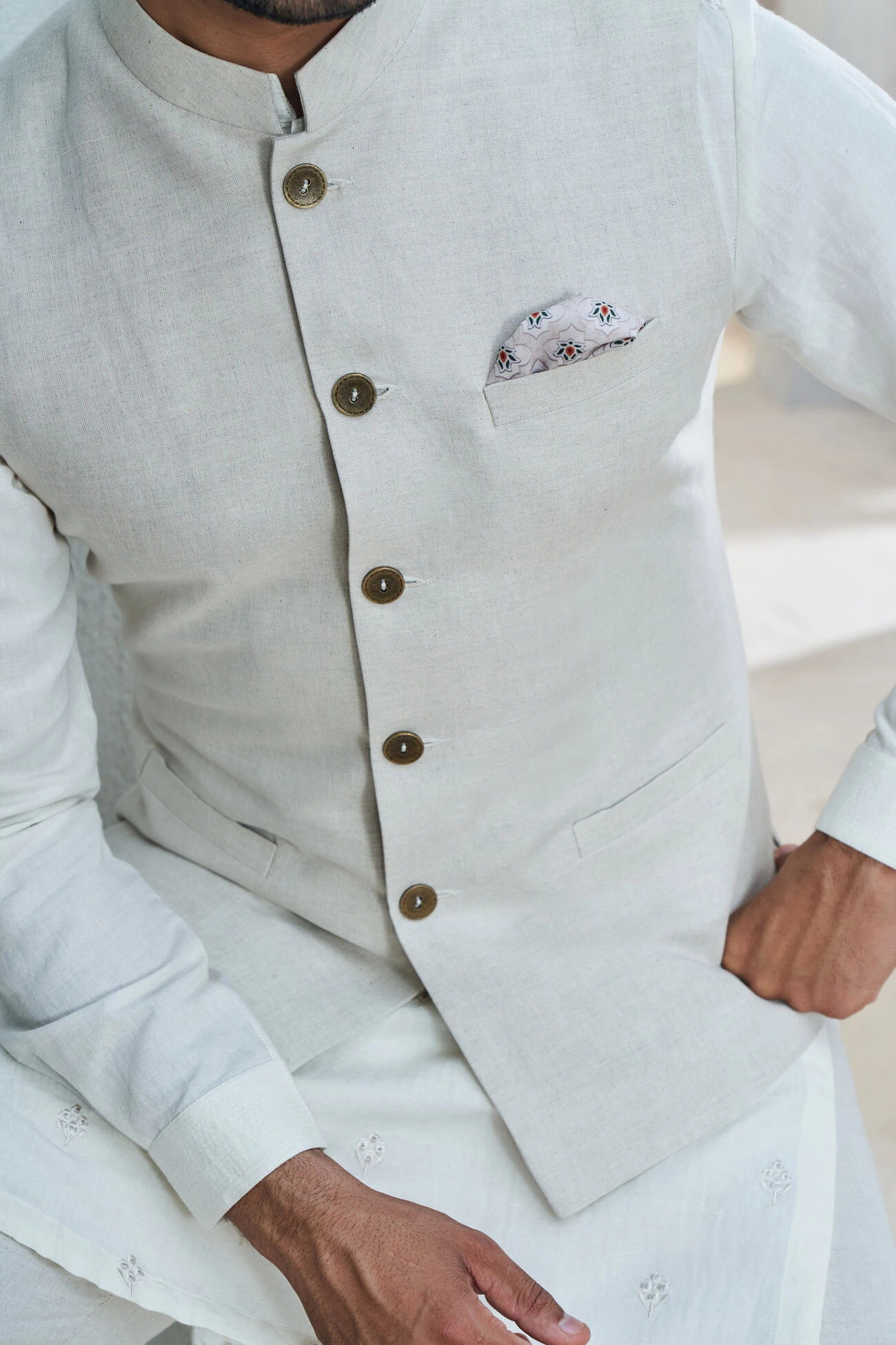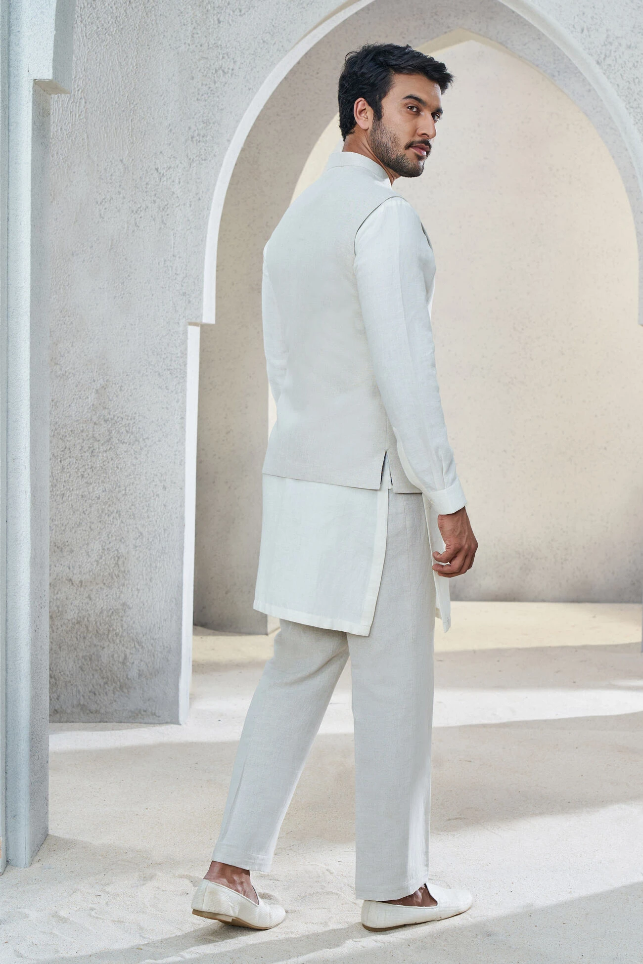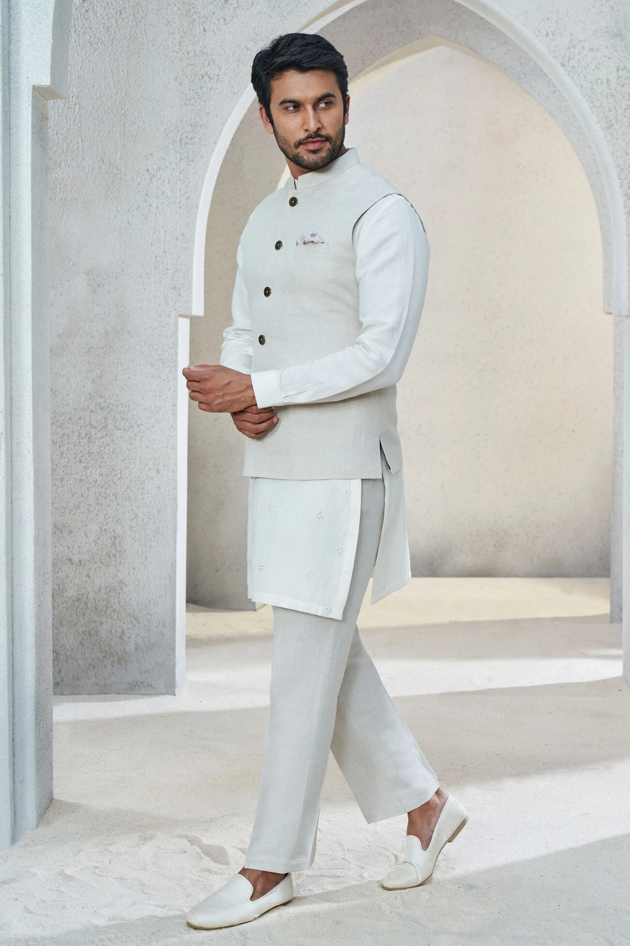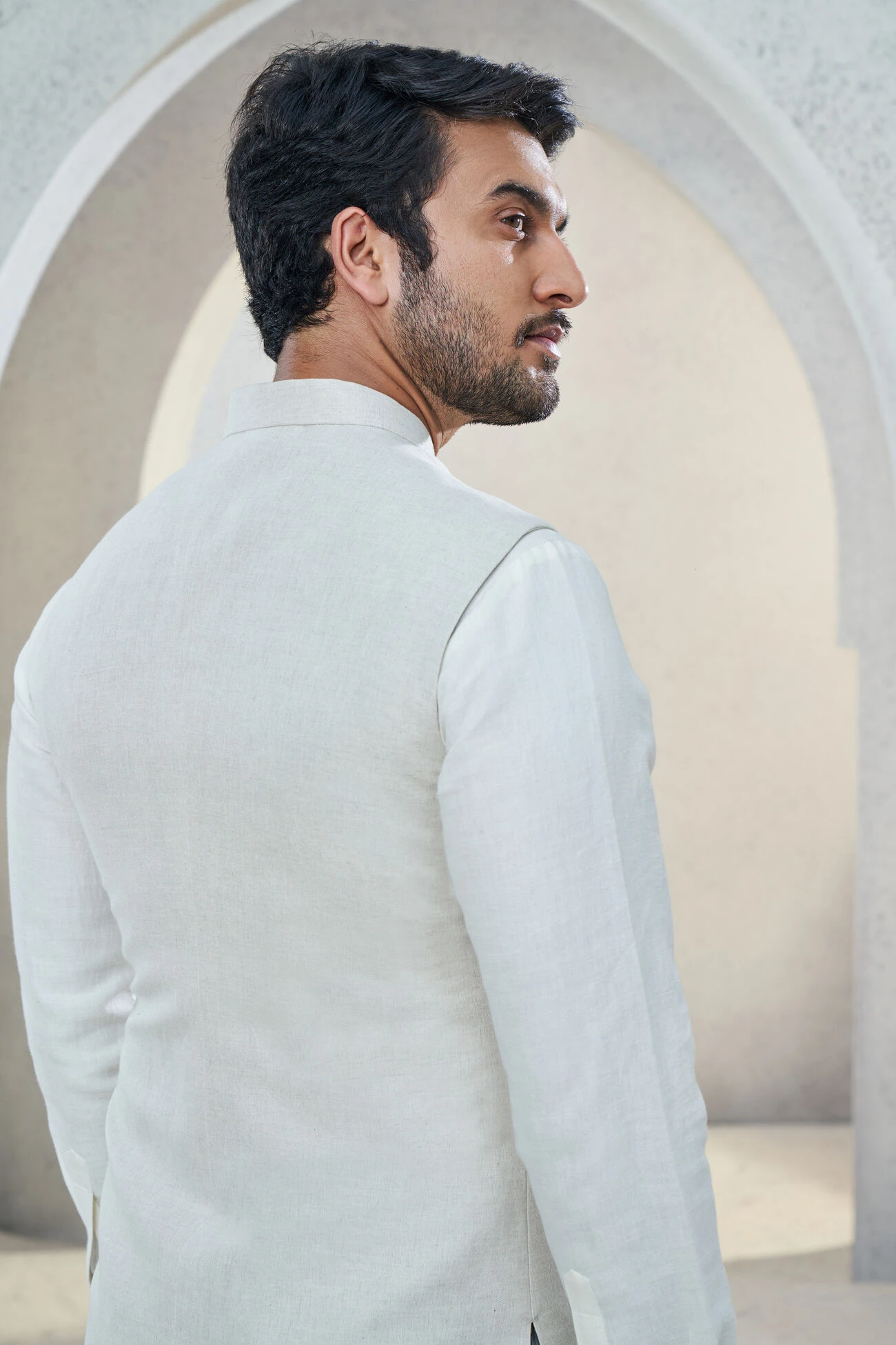 Lending a quintessential yet royal appeal, the Akshaj bandi made from classic cotton linen, signifies a stunning couture for the contemporary man.
