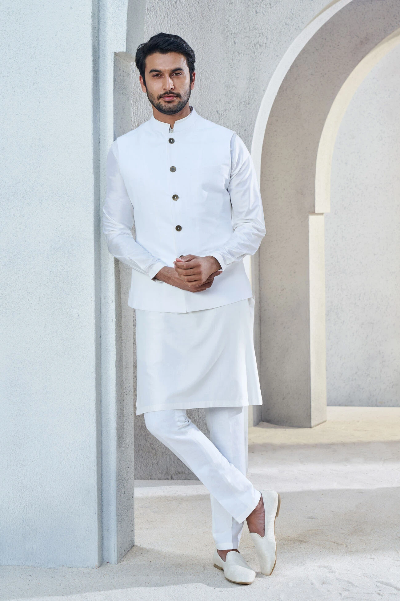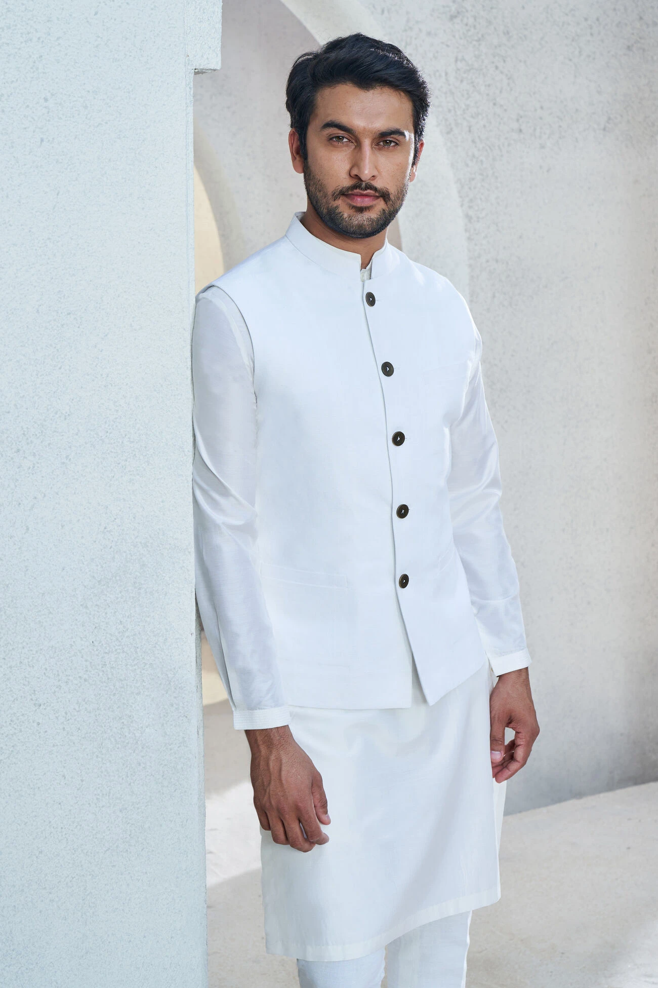 Lending a quintessential yet royal appeal, the Akshaj bandi made from classic cotton linen, signifies a stunning couture for the contemporary man.