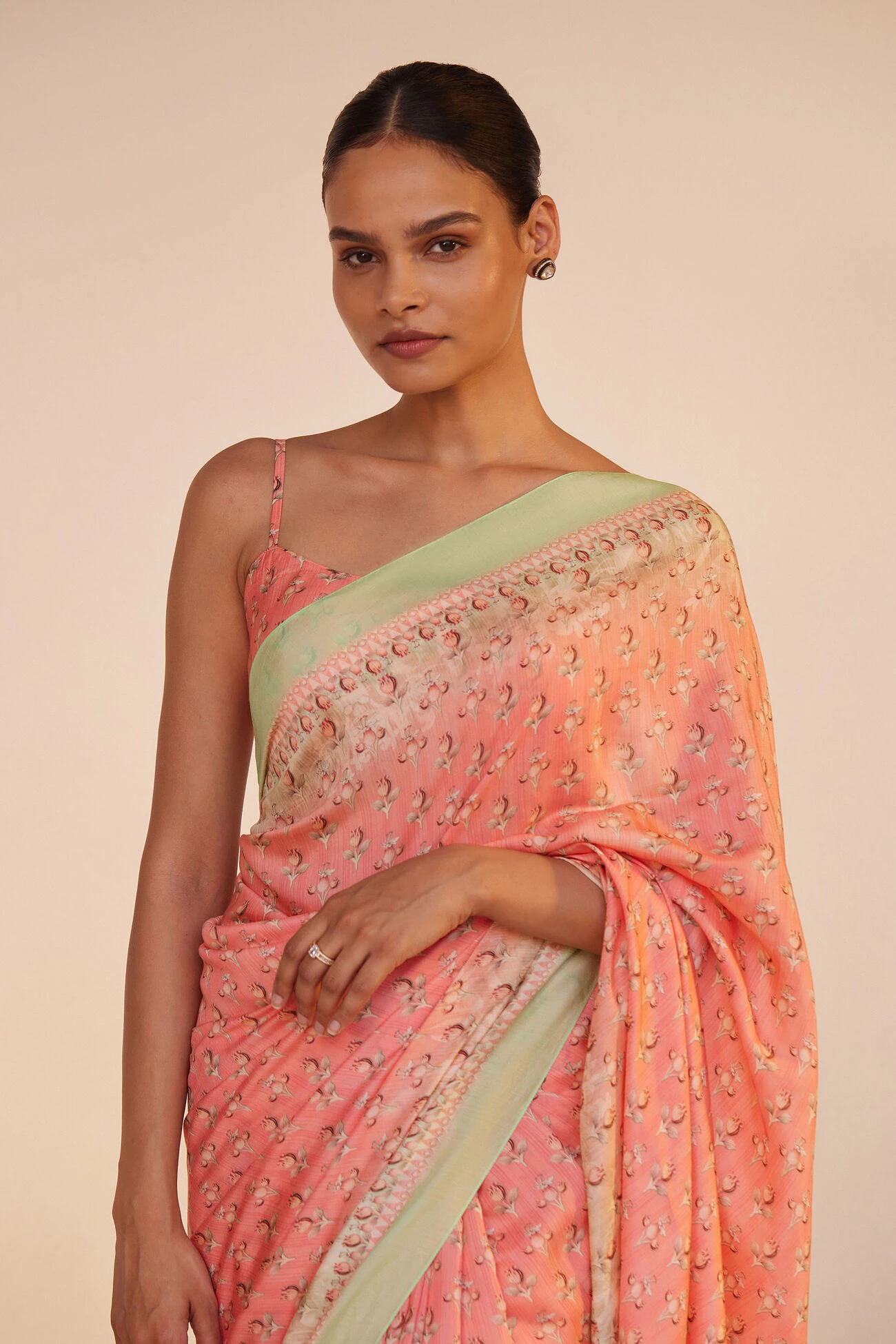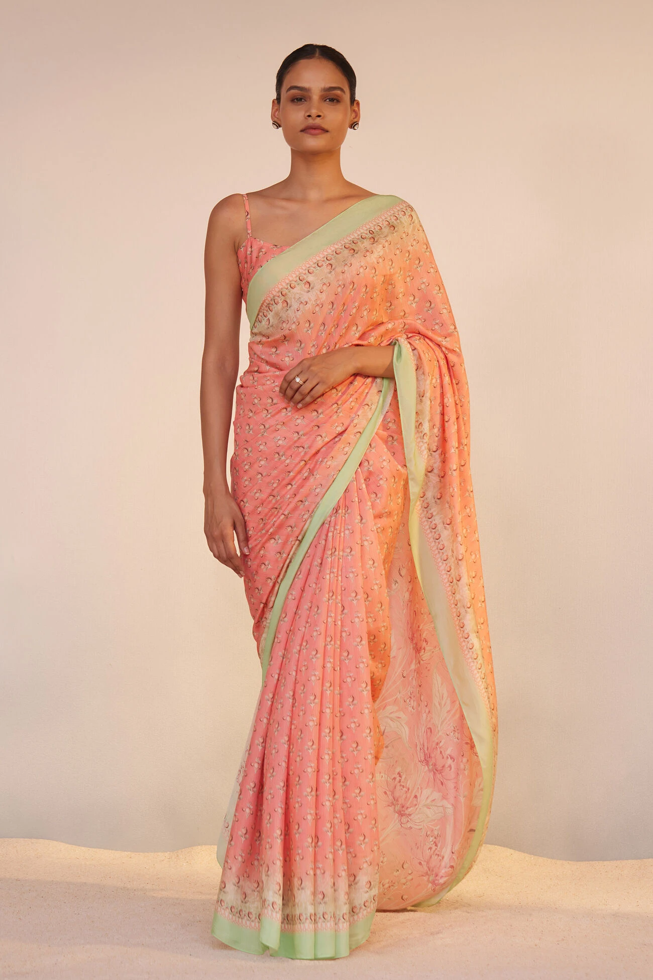 Elegant floral prints make Umaiza a must-have drape. Light as air and fluid, this saree is perfect for your summer wardrobe.