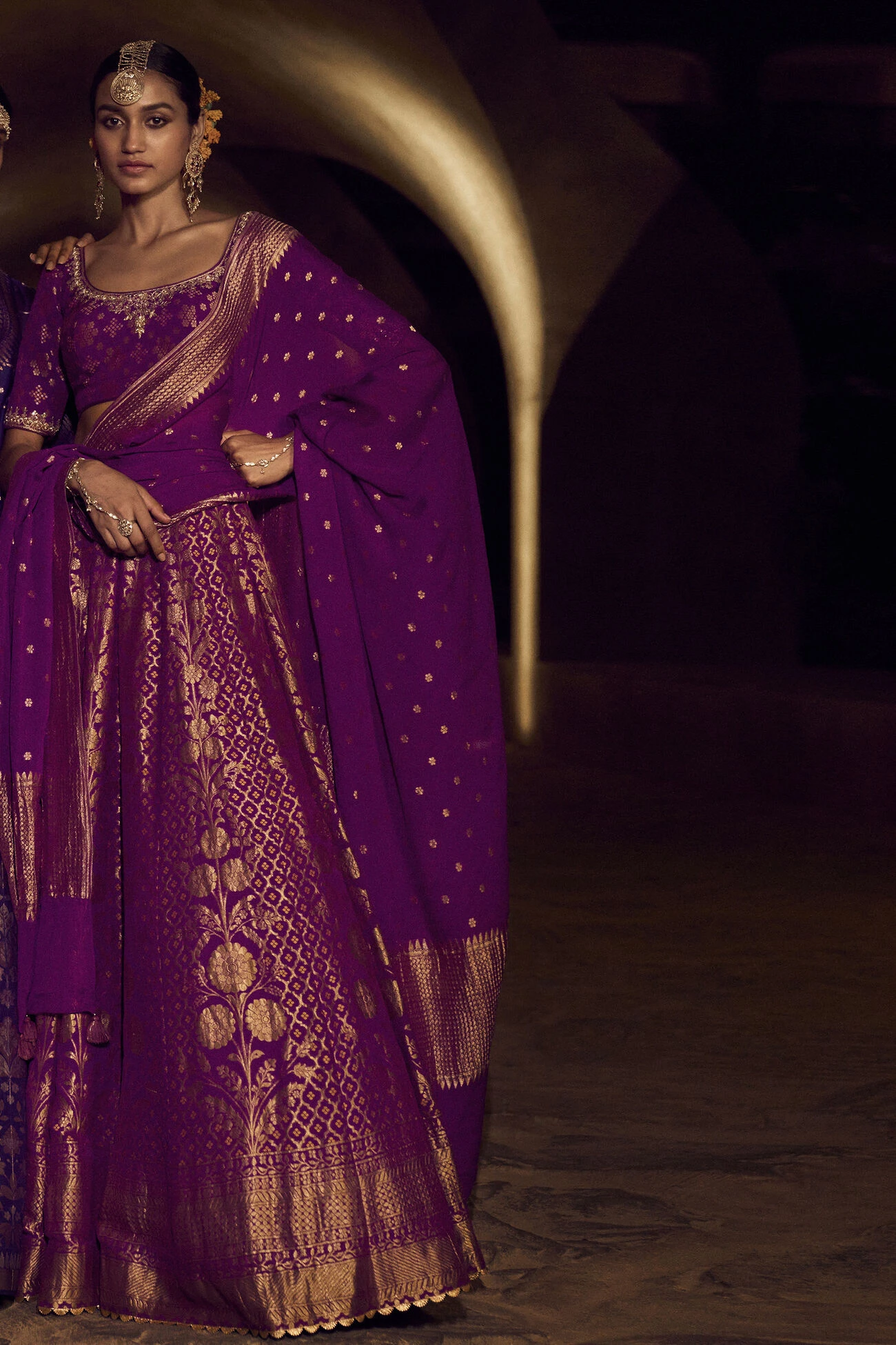 Our Valimai Lehenga Set, handcrafted in Banaras georgette by our master artisans. Light and upbeat, the gold metal accents evoke a classic evening vibe.