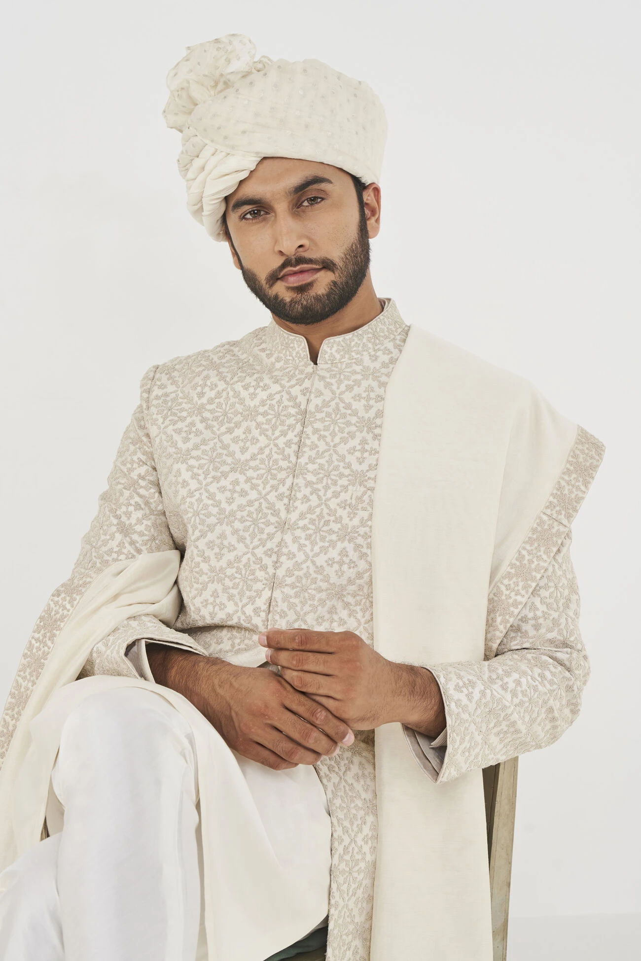 The beige silk safa decorated with silver polka dots and exquisite embroidery offers a smart and stunning impression.