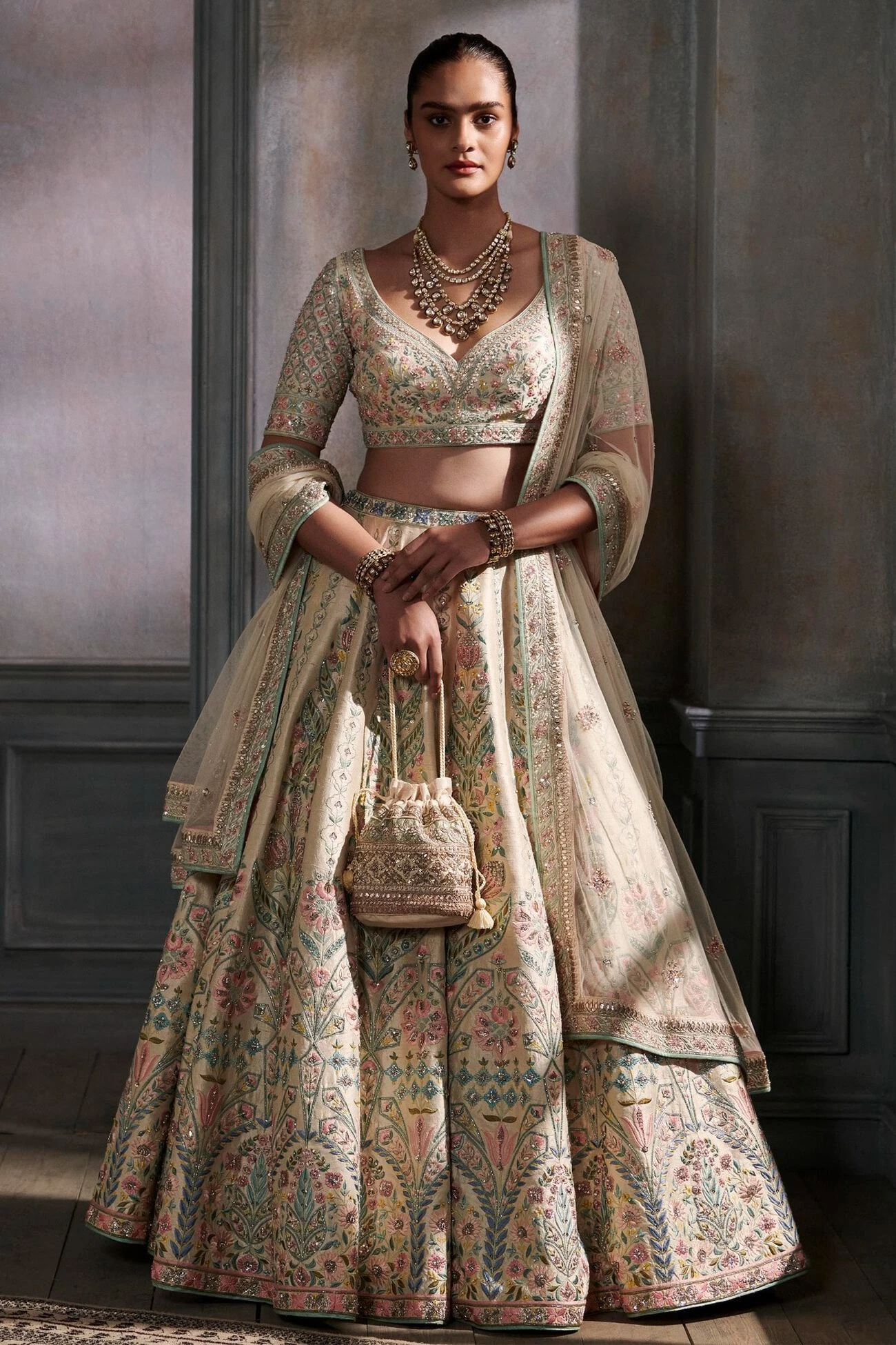A work of meticulous craftsmanship, this cream-hued silk lehenga brings alive imageries of royal art with curving arches and vibrant representations of nature through works of our signature gold gota patti hand embroidery and anchored French knots. The look comes complete with pockets.