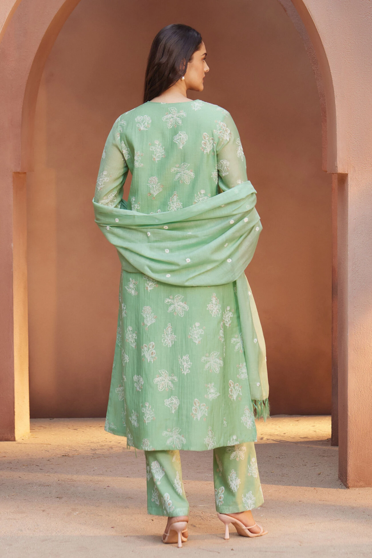 Zaiba is crafted with elegant floral prints in a pastel green palette. The subtle embroidery adds to its minimalistic elegance, making it a versatile wear.
